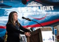 Dr. Kathryn Bertany speaks at a press conference to announce a partnership between Life Flight Network and Bozeman Health on Friday, March 19, 2021, at the Life Flight Network Bozeman Hangar.